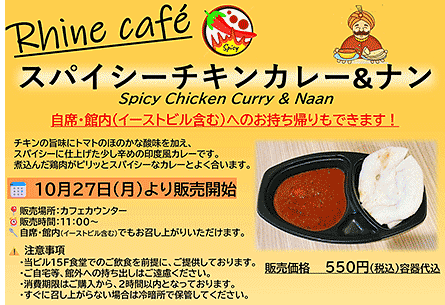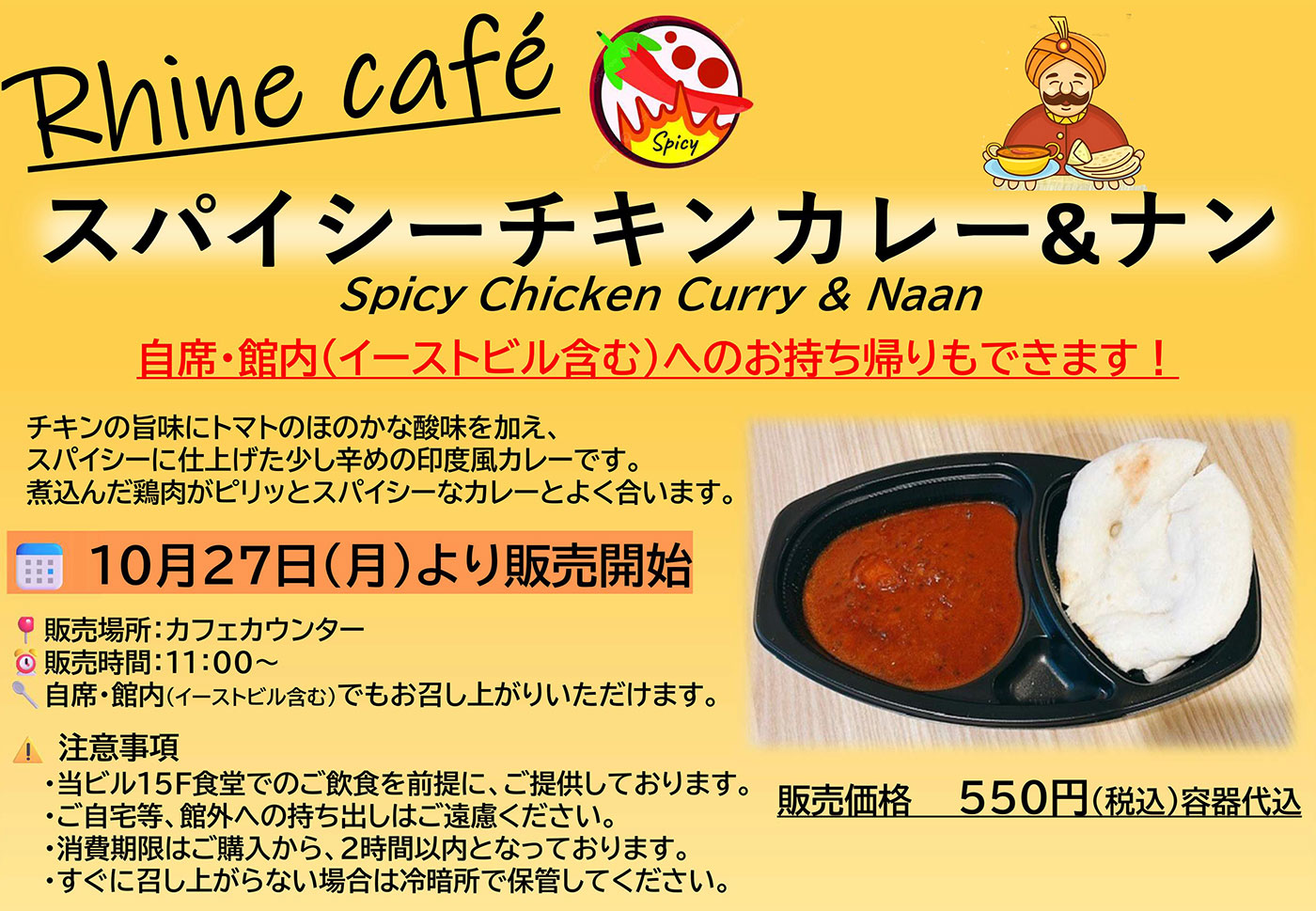 ただ今、ラインカフェではスパイシーチキンカレー&ナンを販売しています。煮込んだ鶏肉の旨味にトマトのほのかな酸味が加わったスパイシーなチキンカレーです。テイクアウト容器でご提供いたしますので、食堂でも館内自席でもお召し上がりいただけます。
