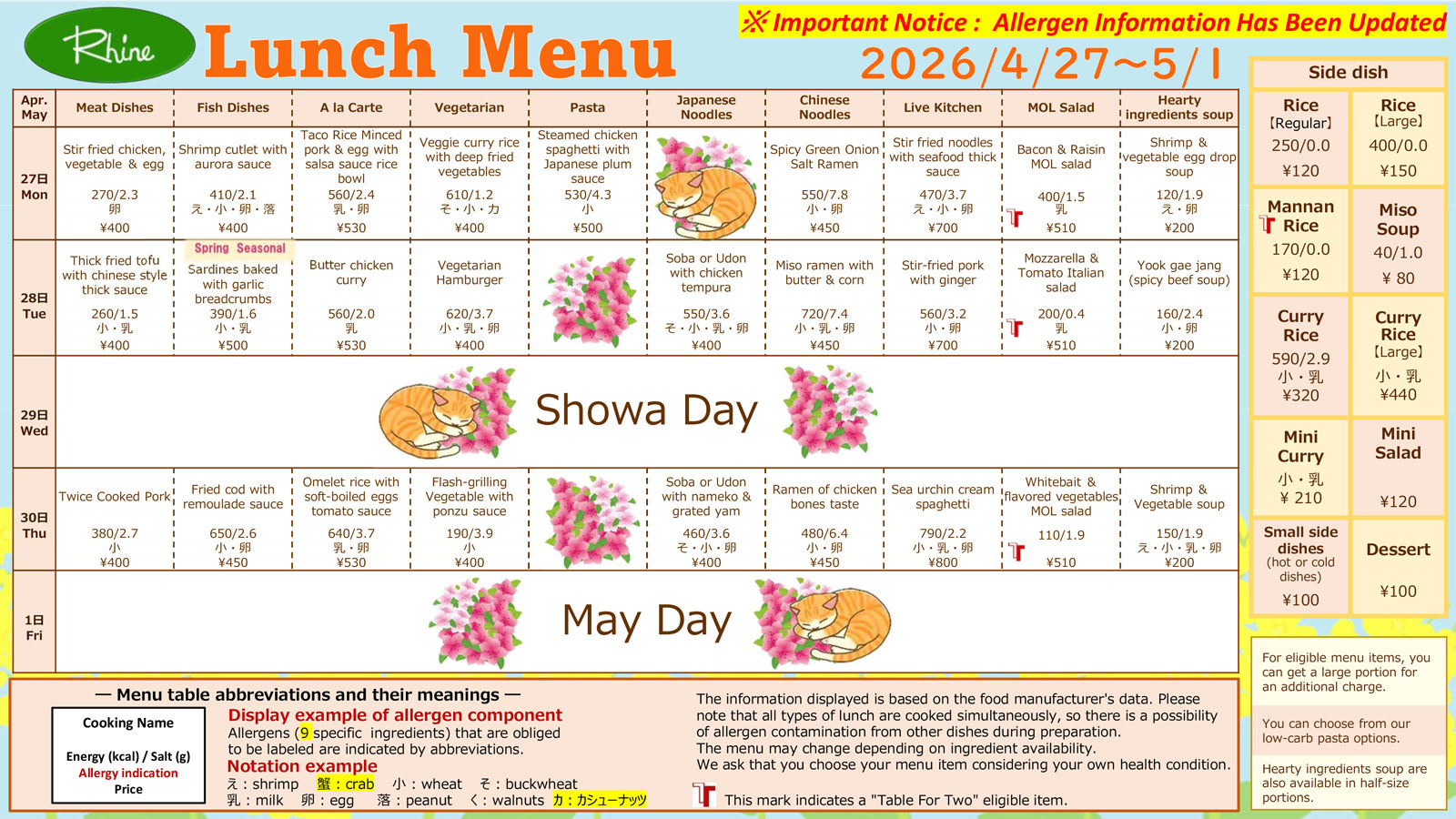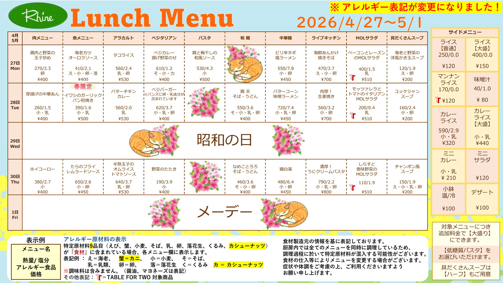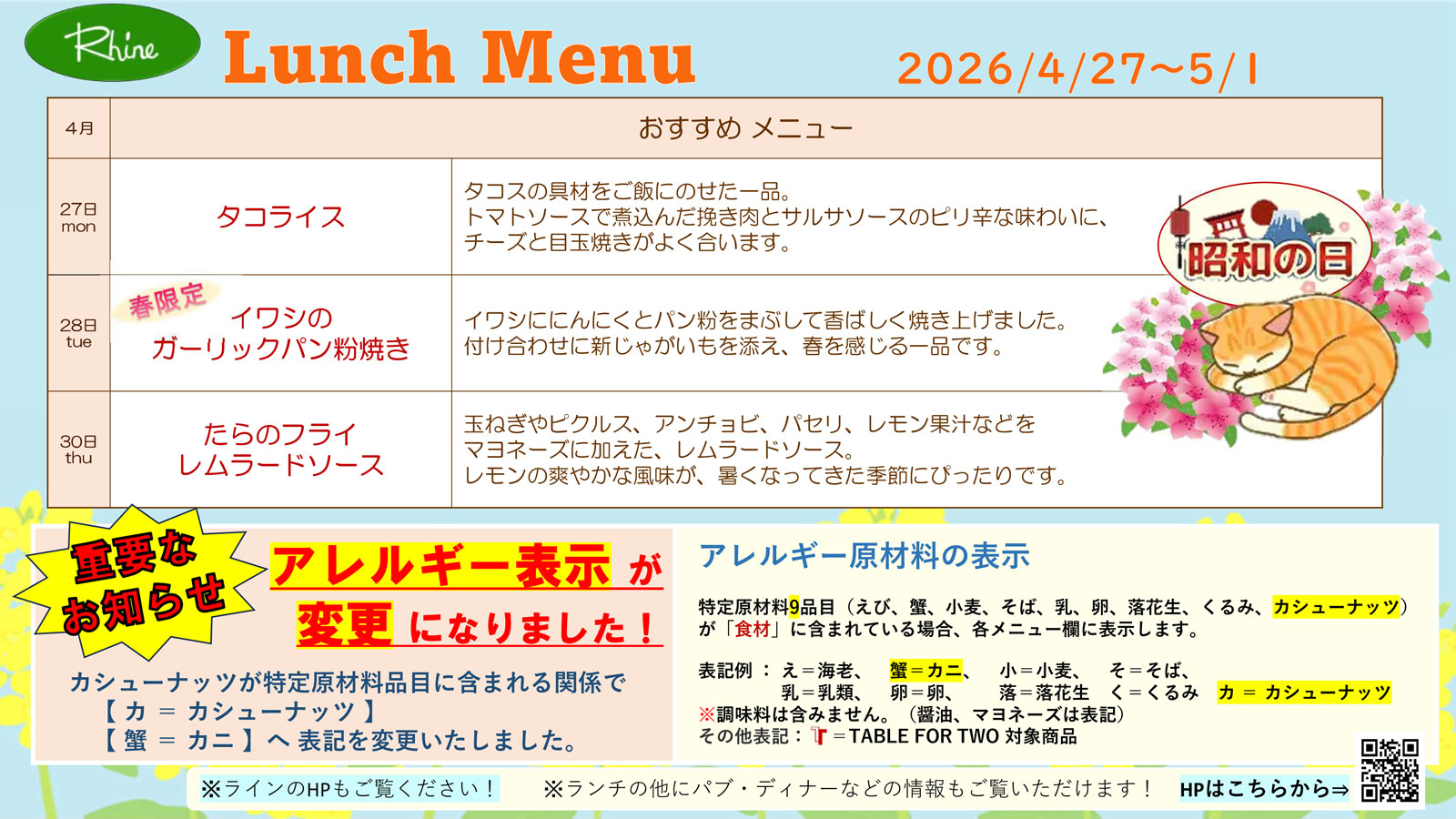 今週のおすすめメニュー 4/27~5/1 (11:30~13:30)