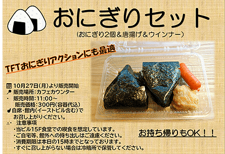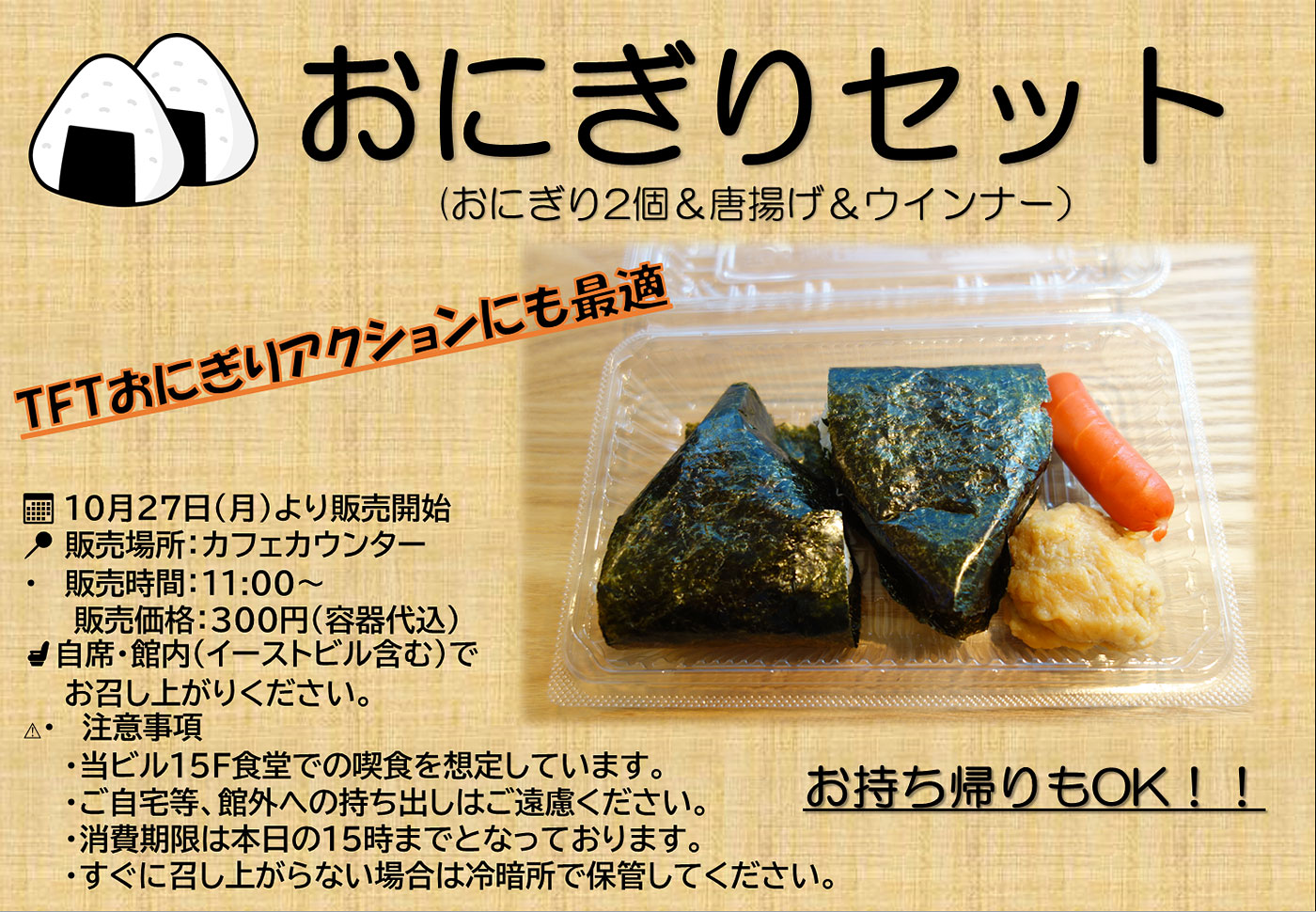 ただ今、ラインカフェではおにぎりセットを販売しています。おにぎり2個と唐揚げ、ウインナーが付いたお得なセットです。また、TFTおにぎりアクションにも最適ですので、ぜひお買い求めいただき、写真を撮っておにぎりアクションにご投稿ください。