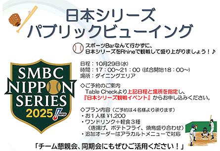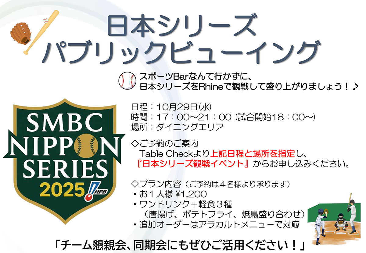 今年も待ちに待った日本シリーズを、みんなで一緒に応援しませんか?スポーツバーに行かなくてもOK!Rhineのダイニングエリアで、仲間と一緒に応援して、熱い夜を過ごしましょう!