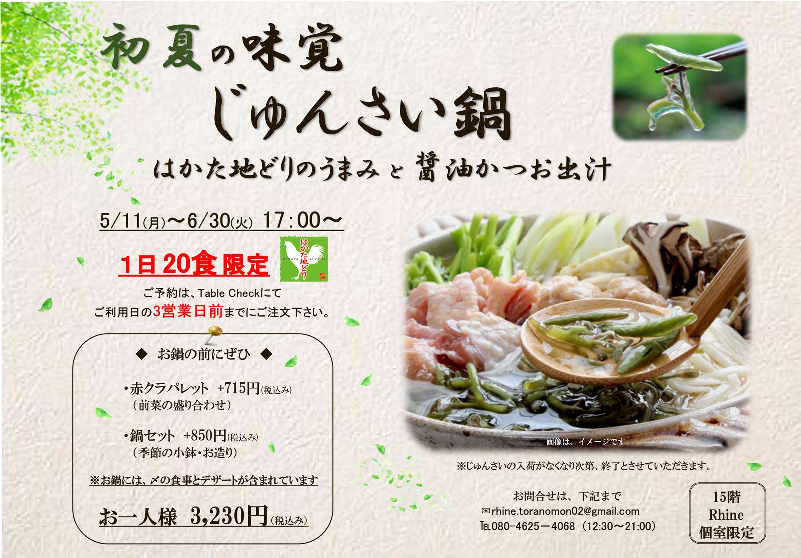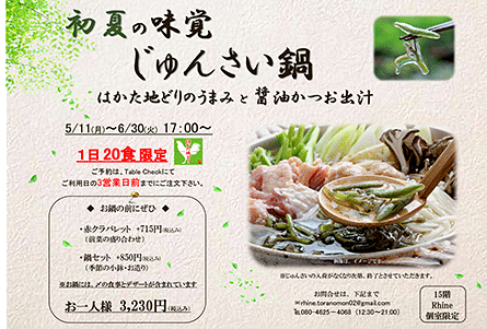 ラインでは、5月11日(月)より、「初夏の味覚 じゅんさい鍋」のご提供を開始いたします。福岡県産「はかた地どり」と、初夏の味覚「じゅんさい」を使用した季節限定の鍋料理です。はかた地どりの凝縮された旨みと、香り豊かな醤油かつお出汁が絶妙に調和し、じゅんさいのつるりとした食感と、涼やかな水辺の風味が口いっぱいに広がる、上品な味わいに仕上げました。