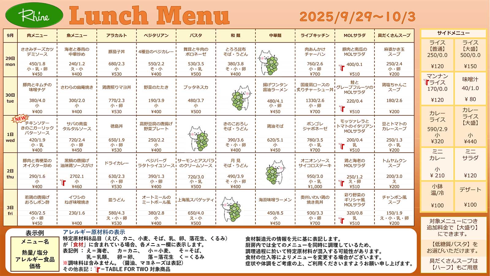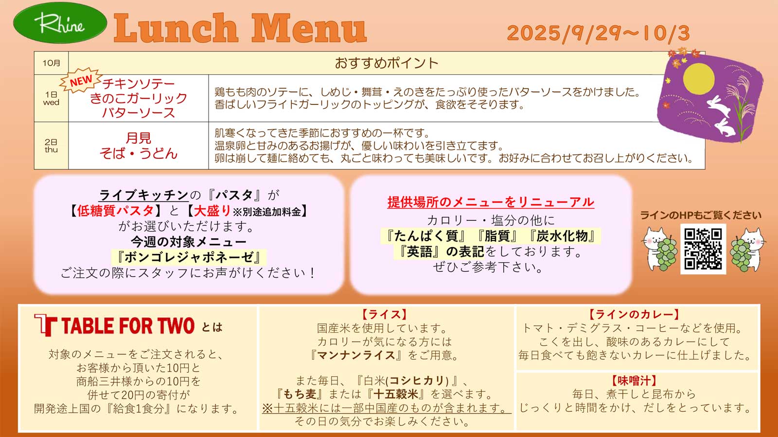 今週のランチメニュー 9/29~10/3 (11:30~13:30)
