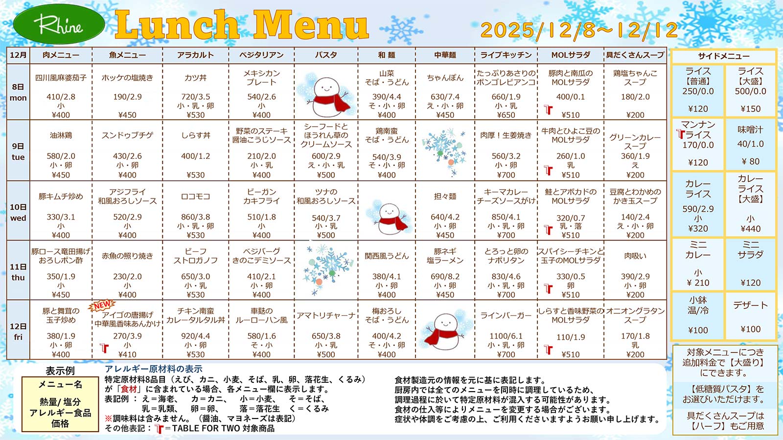 Weekly Lunch Menu 12/8~12/12