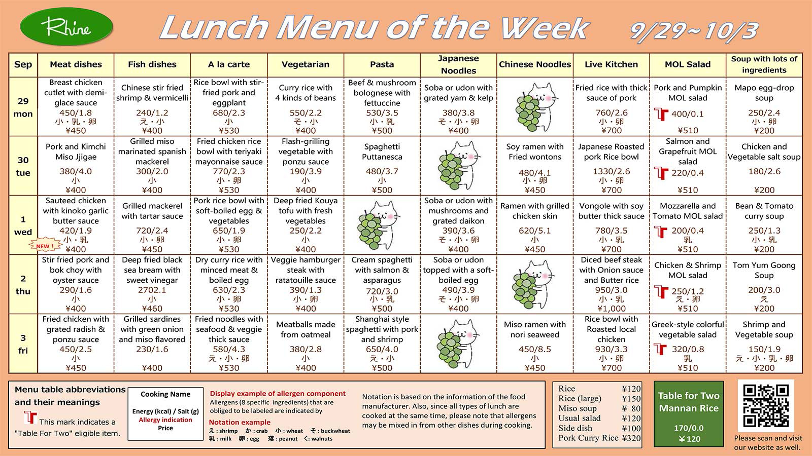Weekly Lunch Menu 9/29~10/3 (11:30~13:30)