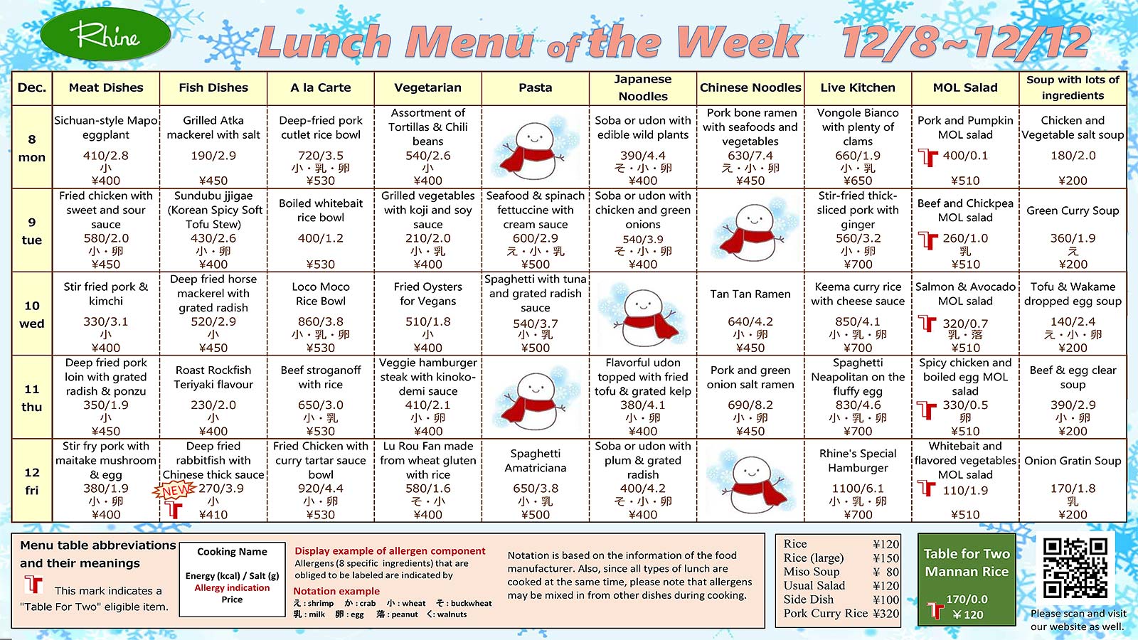 Weekly Lunch Menu 12/8~12/12 (11:30~13:30)