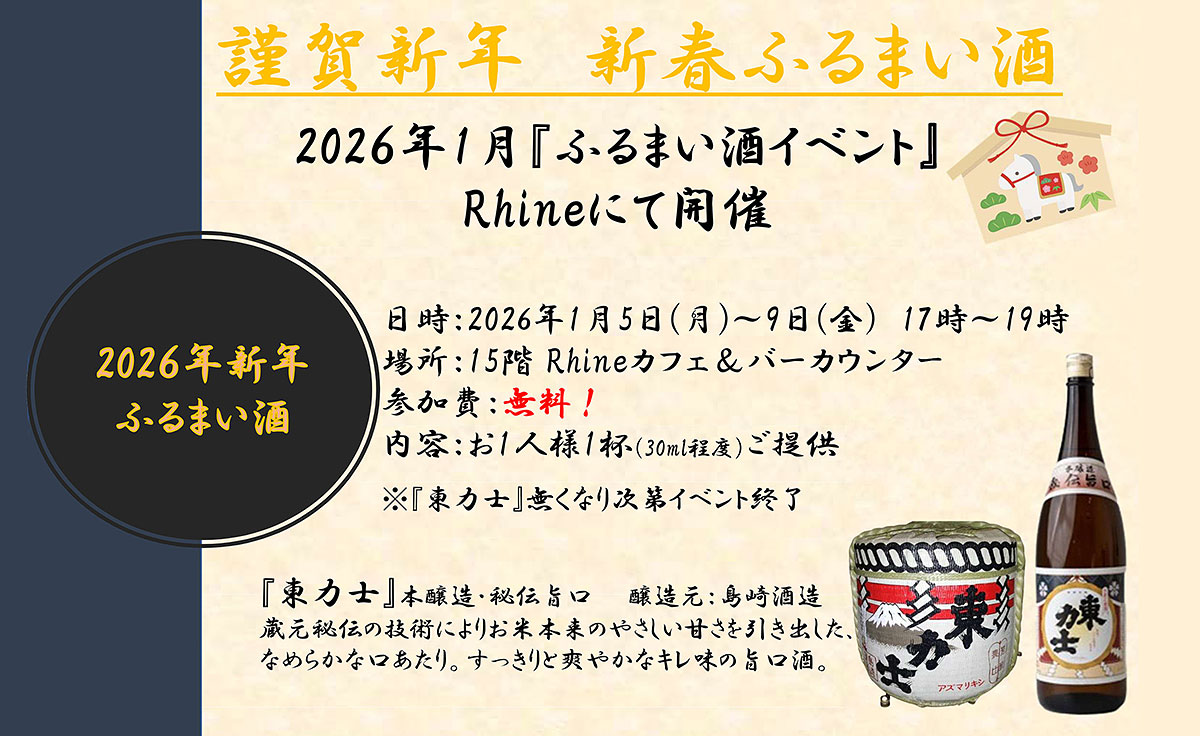 輝かしい新年を祝し、ラインでは恒例の「ふるまい酒イベント」を開催いたします。パブタイムに、すっきりとした爽やかなキレ味が特長の本醸造酒「東力士」で新しい年をお祝いください。