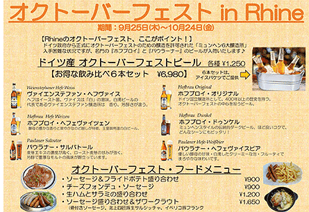 ただ今ラインでは、パブタイムにオクトーバーフェストを開催しております。ドイツ政府から正式にオクトーバーフェストのために醸造を許可された「ミュンヘン6大醸造所」のビールをぜひお楽しみください。また、お得なオクトーバーフェストビール飲み比べ6本セットをアイスバケツでご提供するほか、ドイツビールと相性の良いお料理も多数ご用意しております。