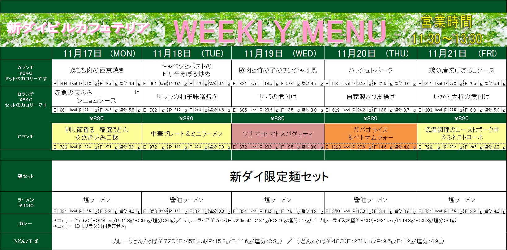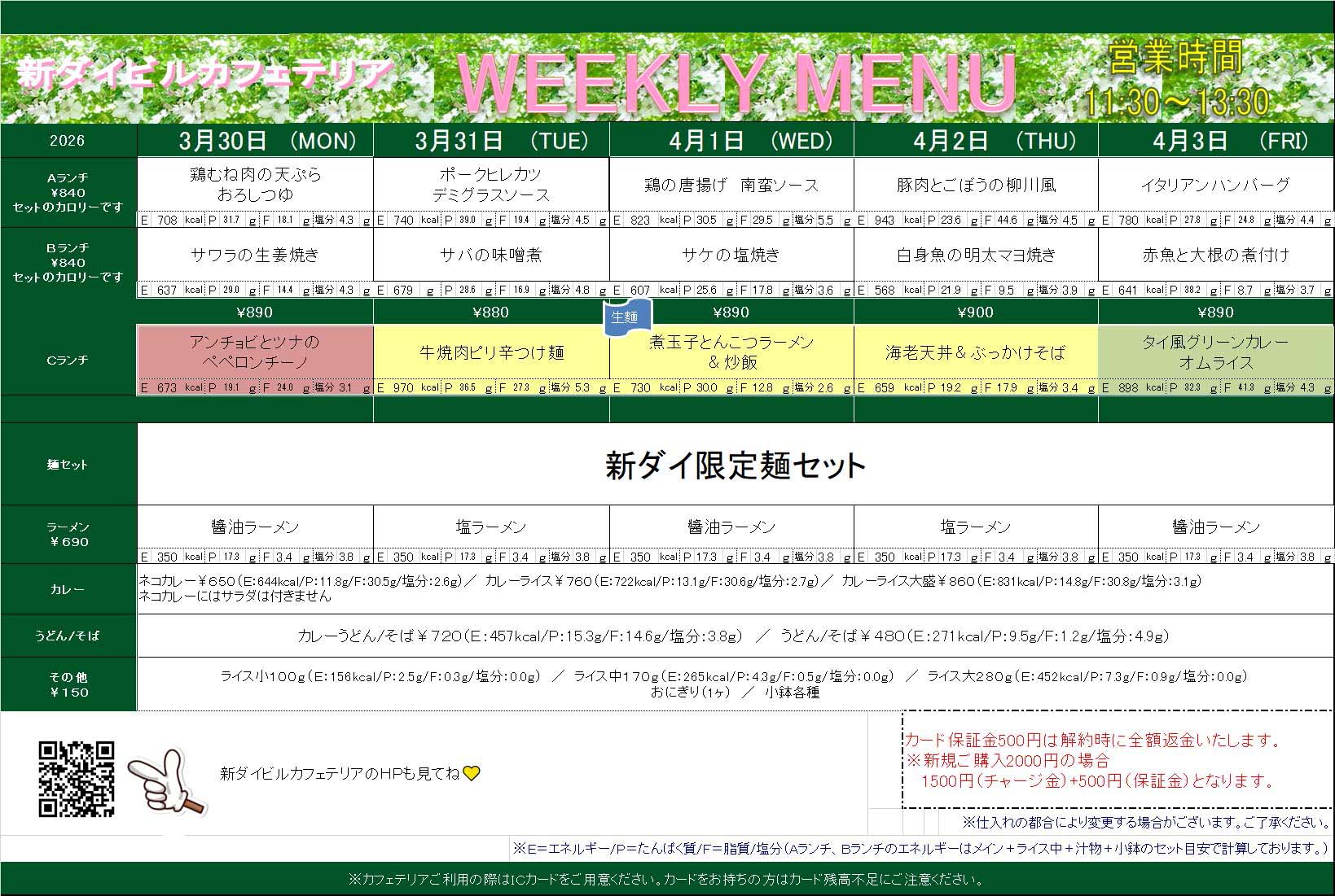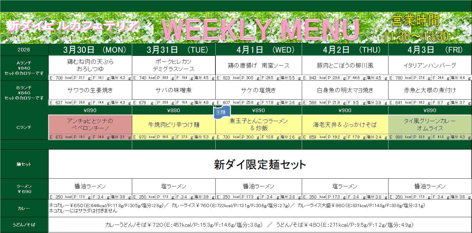 新ダイビルカフェテリアの今週のランチメニューです。美味しいランチを食べてハッピーな一日をお過ごしください。