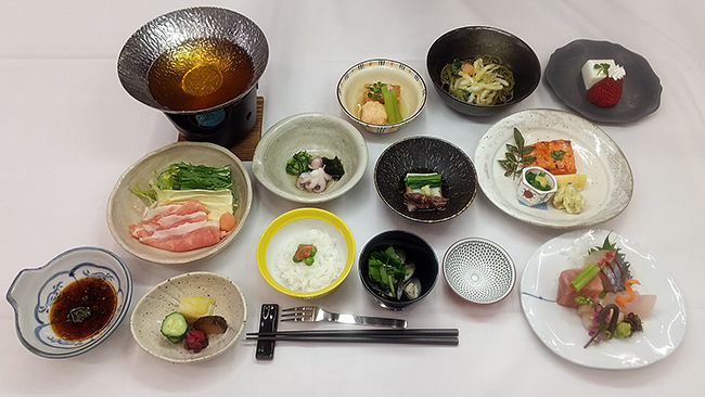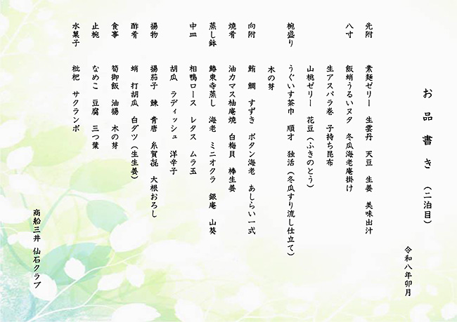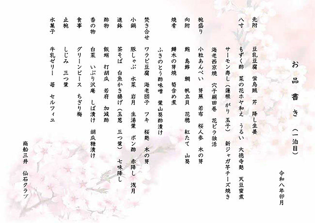 上記のお品書きは、現在ご提供している春の夕食です。拡大してご覧ください。