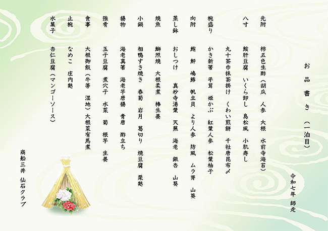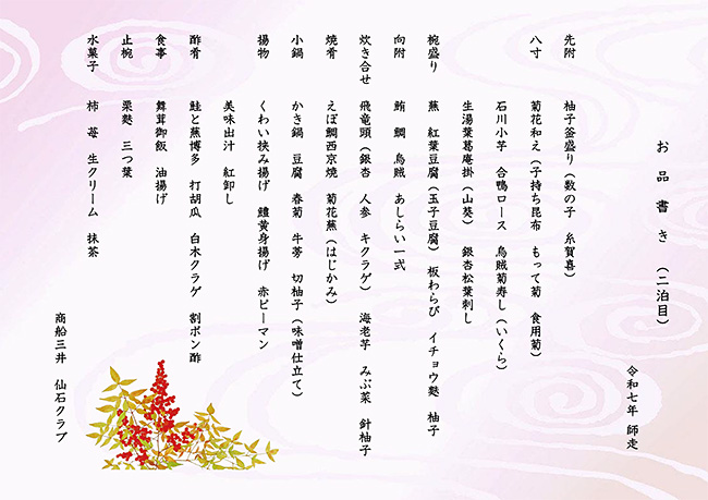 上記のお品書きは、現在ご提供している初冬の夕食です。拡大してご覧ください。